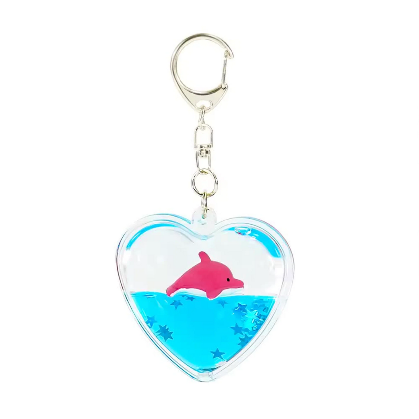 - Floating Pink Dolphin: Inside the charm, a playful pink dolphin floats effortlessly among tiny blue star-shaped particles, creating a serene underwater scene that captivates and delights.