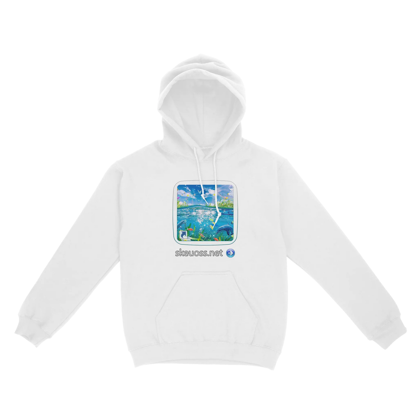 The Skeuoss Hoodie is meticulously designed with the Frutiger Aero aesthetic, capturing the essence of a period known for its skeuomorphic designs and vibrant visuals. The hoodie features a captivating scene that transitions from a lively underwater world to a serene sunny meadow, embodying the spirit of both aquatic and terrestrial beauty.