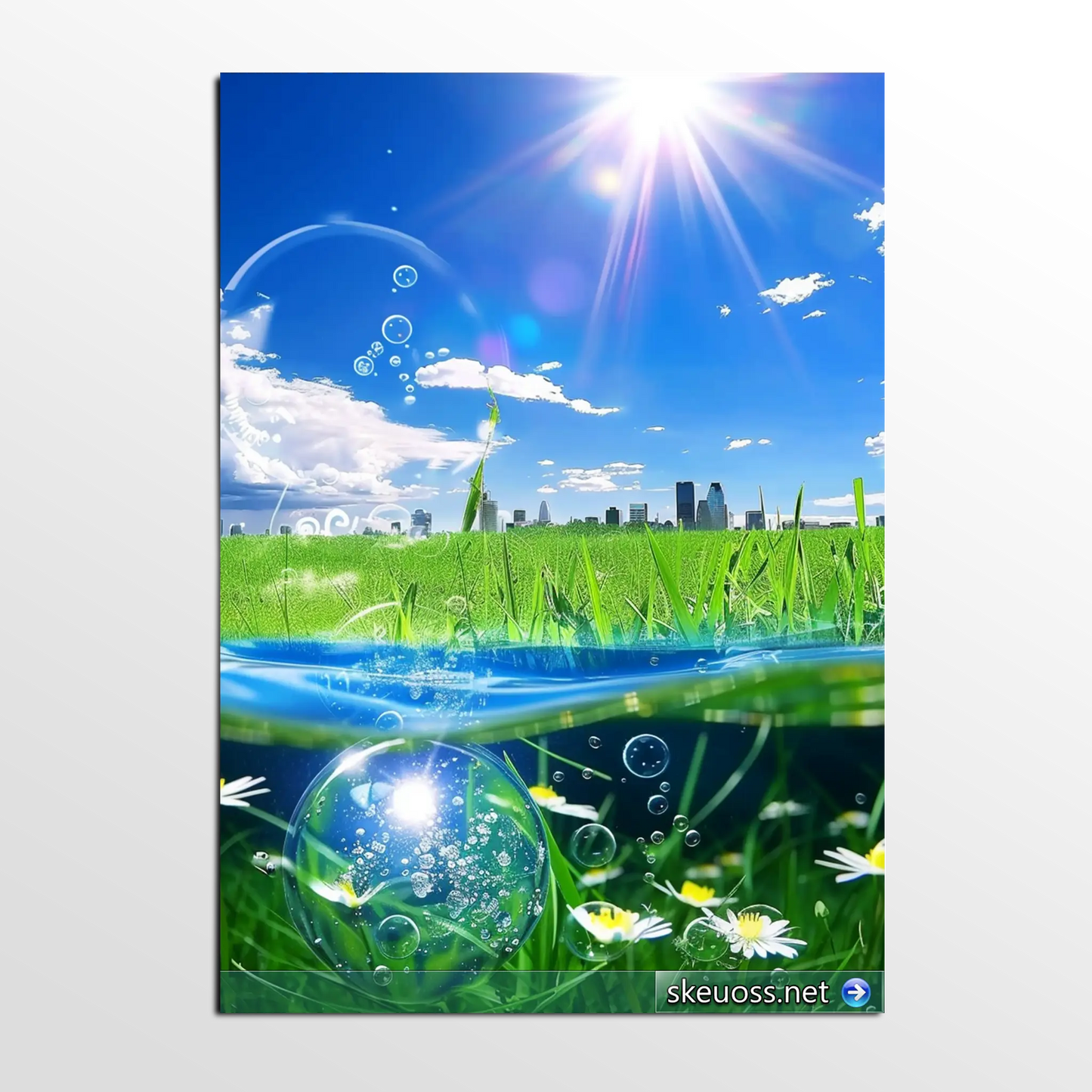 - Water Elements: A crisp waterline bisects the image, featuring shimmering bubbles and a detailed, reflective bubble that mirrors the sky above. This element introduces a cool, calming effect to the design.