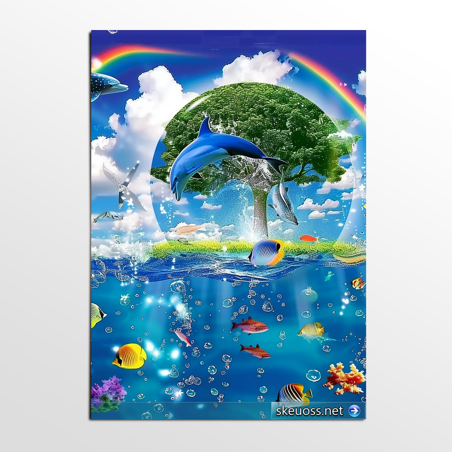 - Dynamic Marine Life: Watch as a playful dolphin leaps gracefully near the island while colorful tropical fish explore the thriving underwater world filled with rich corals.