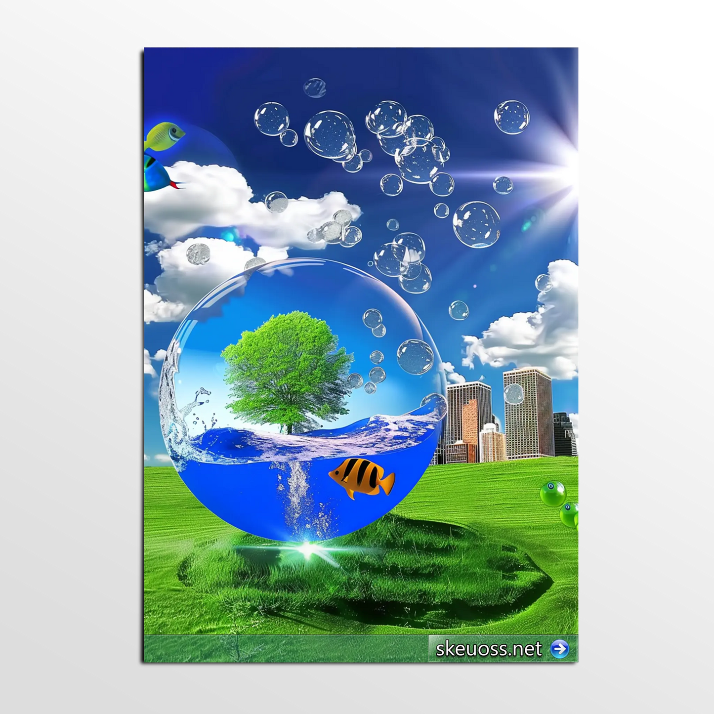 The Skeuoss Design #425 features a surreal and vibrant landscape that captures the imagination at first glance. At the heart of this artwork is a large, transparent bubble that houses a miniature ecosystem. Inside, you'll find a solitary tree, gently flowing water, and a lively fish swimming in serene harmony. This central bubble is not just a focal point but a gateway to a world where nature and fantasy intertwine.